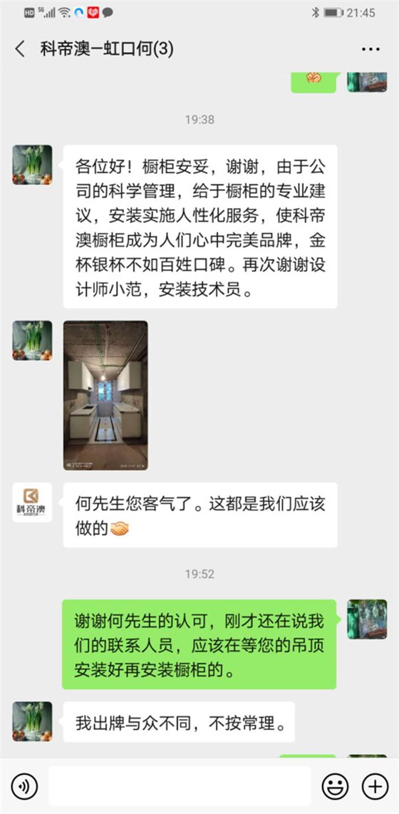 何先生终于放心地下了订单。7月中旬终于等到何先生橱柜安装的日子了。何先生特意发了感谢的话语给到我们。对科帝澳不锈钢全屋以很高的评价。科帝澳不锈钢全屋以优良的品质和优质的服务赢得客户的口碑。